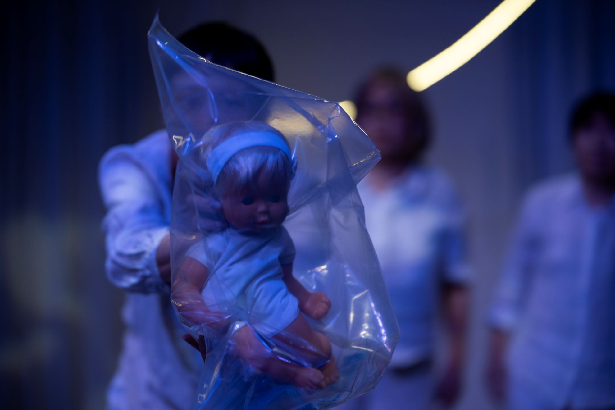 開場,三位表演者邊收拾衣物,邊以不同語言穿插叨念著「荒謬」與「荒誕」兩詞,並結尾於一枚刻印著表演者與觀眾都幾乎看不清的《金剛經》的小小印章上。一切有為法,如夢幻泡影,這一段插曲,隱隱涵蓋了這場演出。餘下四十分鐘的演出,三位表演者所進行的行動並不複雜:拿著藍子收衣、摺衣,間或搭著一種超慢跑的節奏,兼做家務也顧身體,好似種人生的節奏。而各場間掛吊的衣服,暗示了重要的人物或階段:從新生兒的和尚衣、到幼兒的上衣與連身衣,或是不同時期的女裝。對應著兩個玩偶——看診時表明「快死掉」的奧莉薇娃娃,以及一個女嬰的玩偶。奧莉薇的垂死是一種內在受傷的狀態,而嬰兒玩偶則是急需急救;前者被找到時是在抽真空的袋子中,而後者,則被放入袋中吹氣、給予生機。