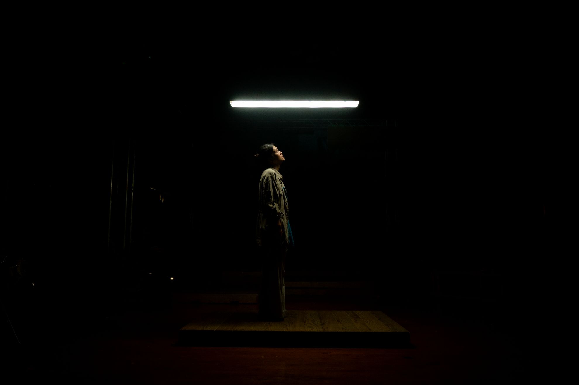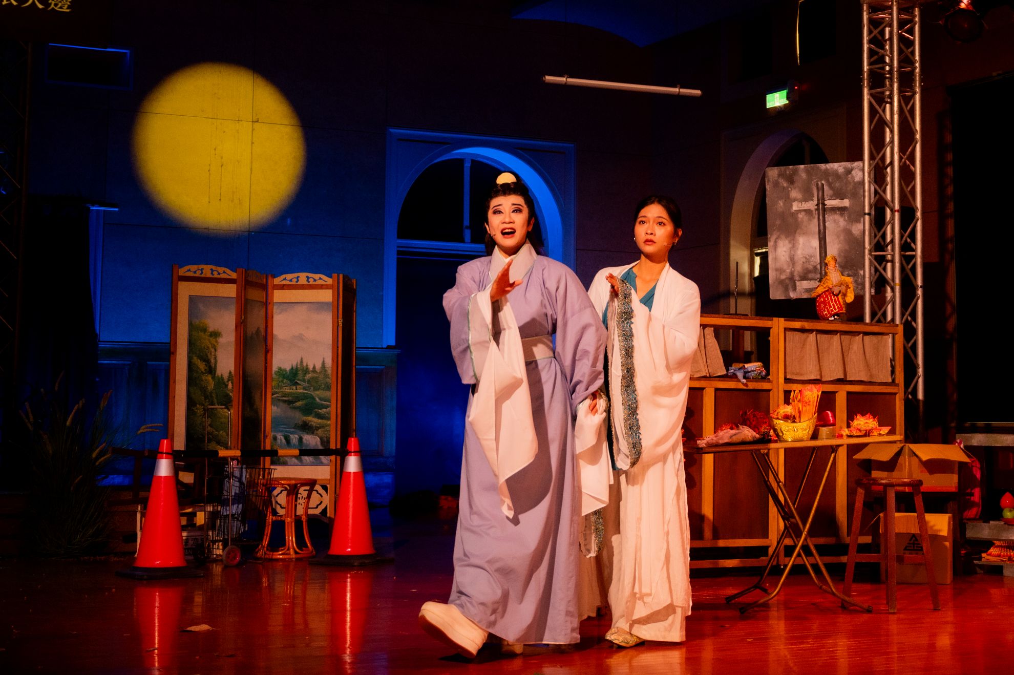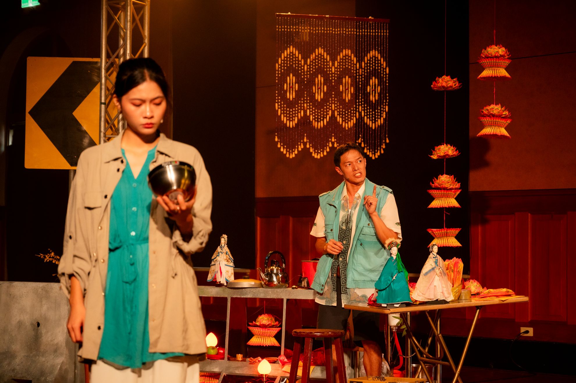 2023年首演於「戲曲夢工場」的《斷橋》,今年於臺南藝術節載譽歸來,移地於吳園藝術中心演出,以單面台形式呈現,觀眾席以塑膠椅與地墊搭建,營造出如同坐在廟埕看戲、彼此比肩而坐的體感,試圖在非典型的劇場空間中,召喚一種常民的集體記憶。舞台右側以桌椅、捕蚊燈、啤酒、流理台等日常物件打造金紙舖,舞台左側靠近藝師的位置擺放著象棋桌。這些貼近「土地」的庶民景觀,寫實地打造主角從城市社運創傷回歸鄉里的物理空間,也暗示鄉土作為她尋求療癒的歸宿。舞台中央大幅留白,則為表演者保留了充裕的跨時空演繹空間。