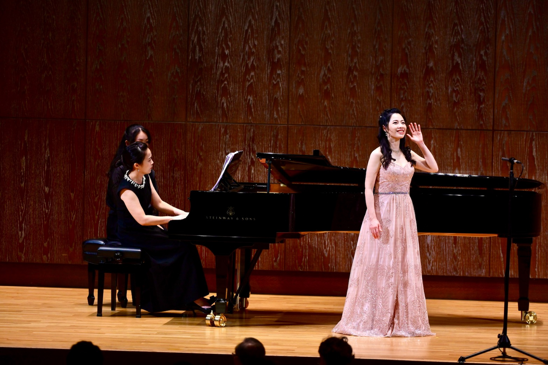 而「美聲唱法」(Bel Canto)這個字,真正開始廣泛地使用,卻是延遲到了十九世紀中葉。其中主要的原因,是為了有別於當時聲樂風格的改變,以往輕巧、流暢、富有旋律線條的花腔開始沒落,取而代之的是厚重、強調戲劇化的聲音。在聲樂的領域裡,美聲唱法強調優美的音色、清晰的咬字、流暢的旋律,至今依然是聲樂家們追求的一種藝術境界。在這個時期的巴黎,來自義大利的羅西尼(Gioachino Rossini, 1792~1868)、董尼采第(Gaetano Donizetti, 1797~1848)和貝里尼(Vincenzo Bellini, 1801~1835)三位重量級美聲歌劇作曲家,更是掀起了美聲唱法的風潮。女高音林芳瑜利用演唱貝里尼的歌曲,輕鬆地帶出了這樣的歷史脈絡。她聲音乾淨又咬字清晰的演唱,尤其展現在德文曲目中。當演唱到一些頗具童趣的歌詞時,她更是利用肢體上的表演,和鋼琴家吳明靜細緻的觸鍵與音色的處理,再加上插畫風的動態投影,如此的呈現成功地拉近了與台下觀眾的距離。