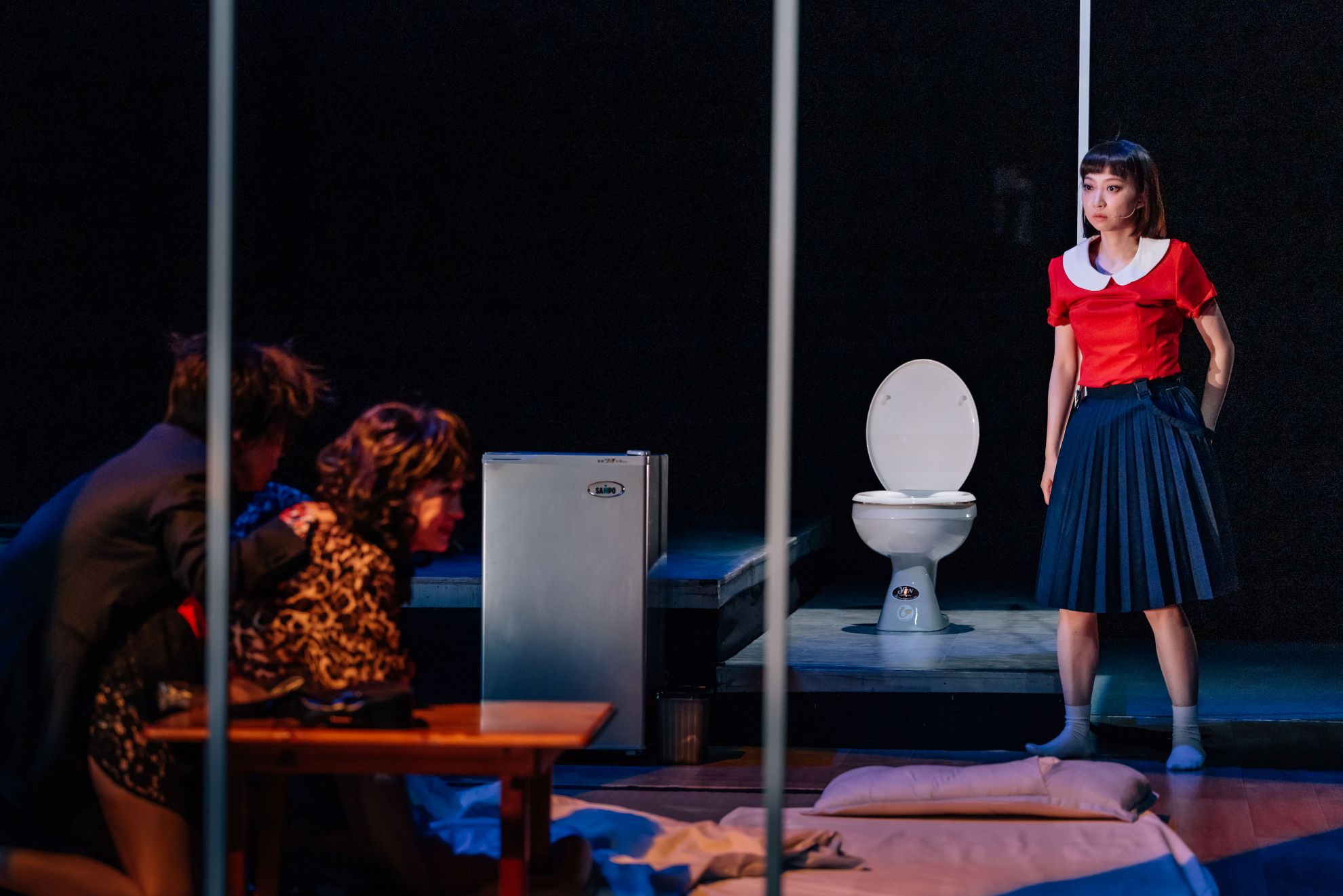 要承擔如此多的議題,情節份量自然不會少,劇情橫跨十餘年,涵蓋三種不同語言,一共四位主要演員,兩個小時無中場休息,聽起來對於臺上台下都是一種考驗,進劇場前會有「廣而不精」、「處理零碎」的擔憂,但本劇出乎意料地完成得很出色。開場便足夠吸引人。初來乍到日本的母女二人要找到立足之地,媽媽蝶子準備去面試,告誡女兒小花在別人面前只能叫她「姐姐」。接著呈現的是一段蒙太奇,時空已然開始相互疊合與印證,蝶子所處的時空是「此時此刻」,她去夜總會面試「歌星」,而小花身處的則是十幾年後,她去航空公司面試空姐。二人同時接受面試,面試官讓她們證明自己想要得到這份工作的決心,二人只得依言再彎下一寸腰。這番處理簡練地交代了主角「寄人籬下」的處境,為後續情節埋下有機的伏筆。在本劇中,一切嚴肅的、宏大的、傷感的,盡數消融於一對母女關係與情感變化的幽微之間。