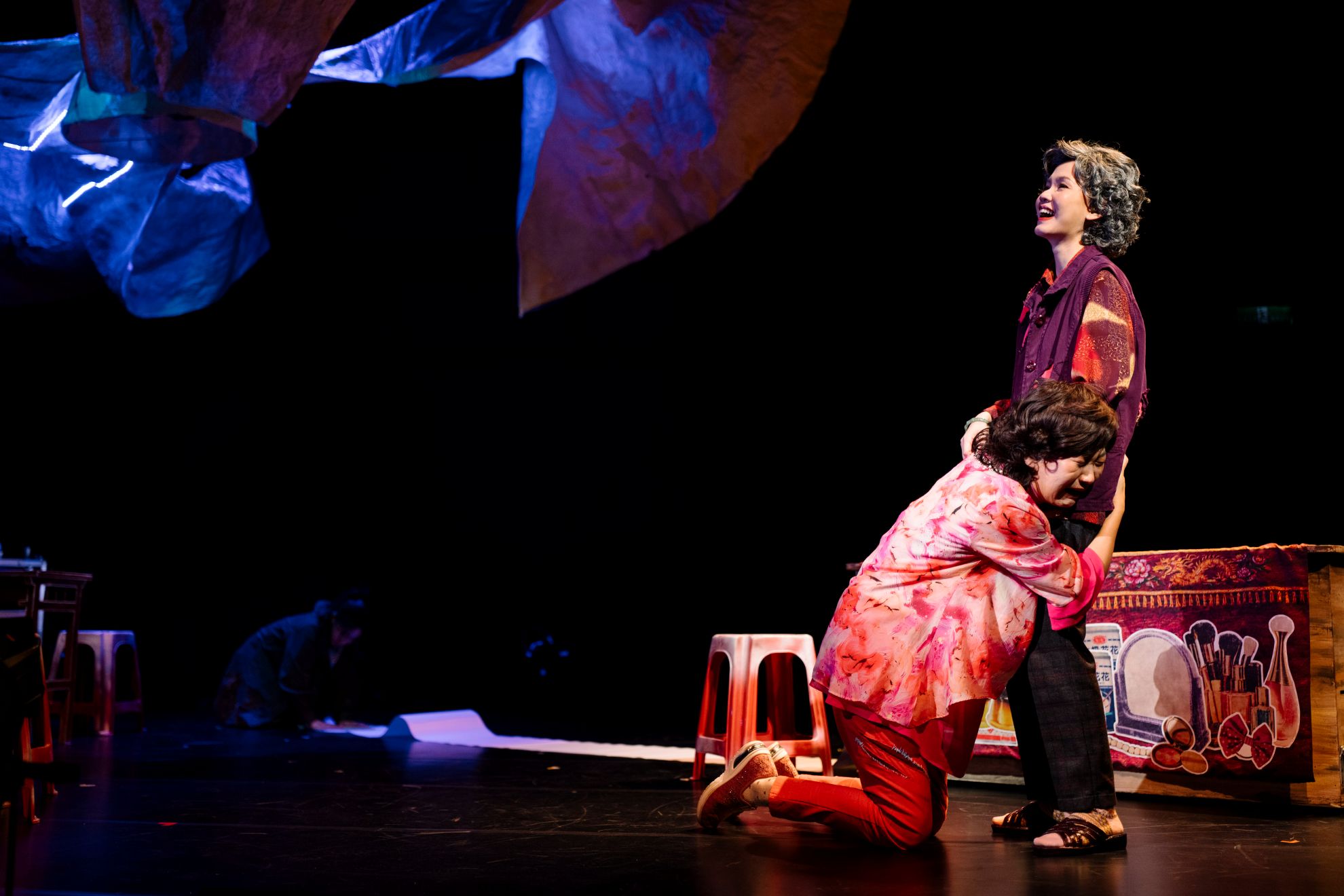 李屏瑤書寫女性族群,不論是家族、家庭、社會、學校,各階層因性別認同或性別結構處境造成困境或創傷,總帶著體恤與寬諒,下筆可說溫柔。《仙女三重奏》除了溫柔,加上故事背景與人物設定,導演加乘選用帶點土裡土氣的鄉土喜感與魔幻時空,整齣戲悲喜雙調,忽而台灣國語刻意誇飾搞笑,忽而光影緩慢身心蜷曲變形。整齣戲涵納了相當多設定與命題:婚姻、母女、世代、性認同、出櫃、性侵與騷擾、性平,乃至隱微的警治或白色恐怖?作為引線的台灣姑娘廟信仰及其形象反而淡筆淺描,女性陰靈信力的力度無法(或者不意欲處理)穿透凡間,未婚女子無主祀與女同無法異性婚配之間,關鍵的宗族結構與新世紀「家」的定義的改寫,於是無力推進到觀念革新。就此,整齣戲多少就停留在上、上上世代女性處境居多,作為第三代真真(李尉慈飾)反而最為虛弱,劇中甚且自嘲「我媽媽幫我出櫃!」演員連說兩次,連角色自身都感不可思議嗎?這確實是許多蕾絲們的夢幻情節,但現實世界,拉子與拉子媽之間的張力卻是最磨人磨心,淚水斑斑。