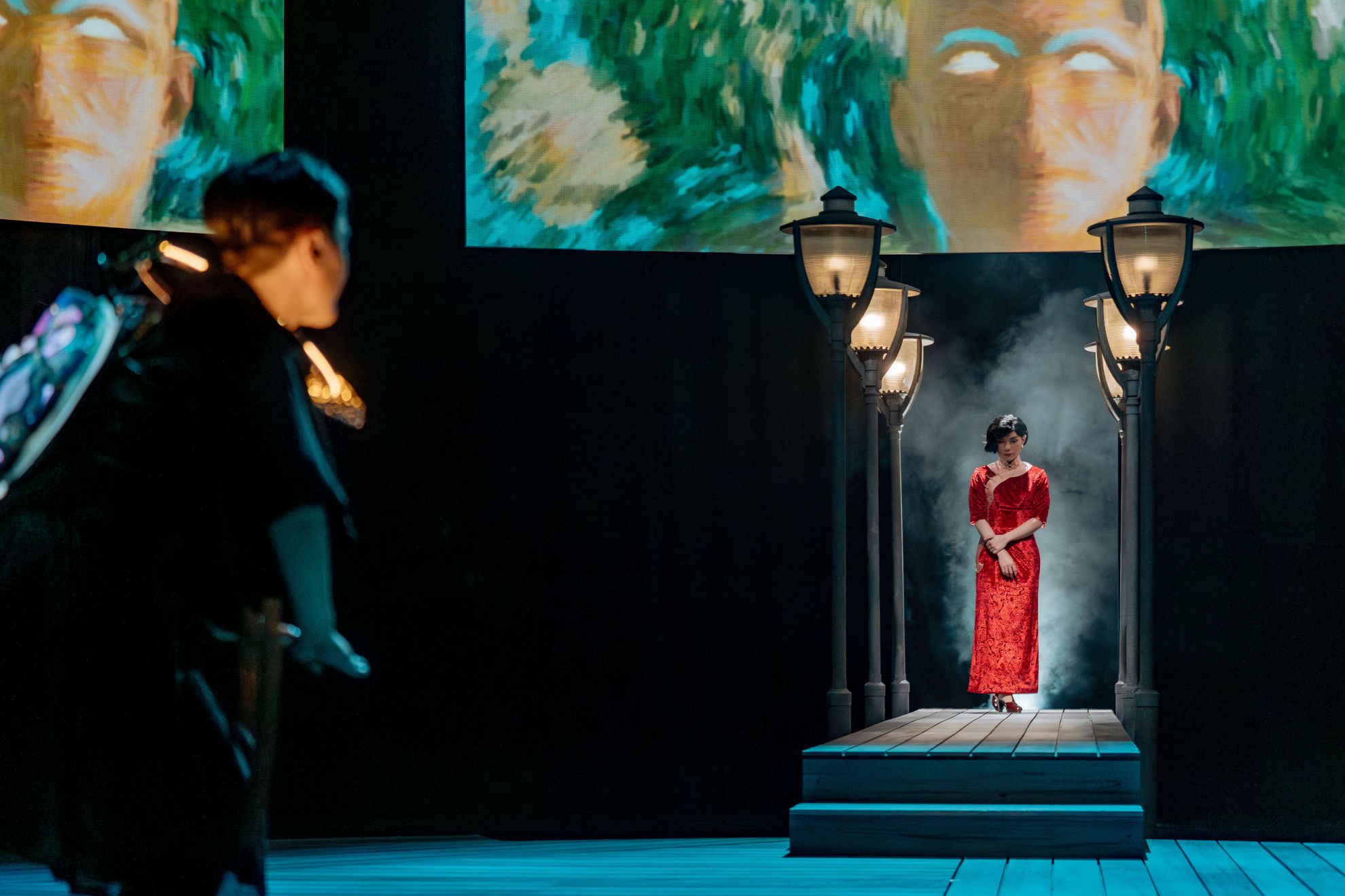 不論袁凡生(崔台鎬飾)穿洋裝,或明代吳岑扮男裝上青樓(崔台鎬、程時雍分飾),演員身體被清楚區分為「異服之前」與「異服之後」,兩者之間幾乎不存在過渡或協商的過程。觀眾看到異服完成後的形象,但看不到扮演如何牽動自我懷疑、自我重構與重新定位的掙扎,例如發言姿態的試探、服裝的剪裁如何重新組織身體感與自我意識等,彷彿衣服只是標示角色身份的符號。尤其由兩位演員分飾女裝與男裝的吳岑,讓觀眾能一眼辨認出角色的狀態,但也暗示兩種「身份」具有明確的邊界。異服被呈現為身份選擇的結果,排除了身體、人際與空間反覆協商的過程,這反而背離了性別作為操演的概念。原本可能構成邊界挑釁的身體變形,反倒被邊界清晰的形象穩定為可辨識的身份符碼。