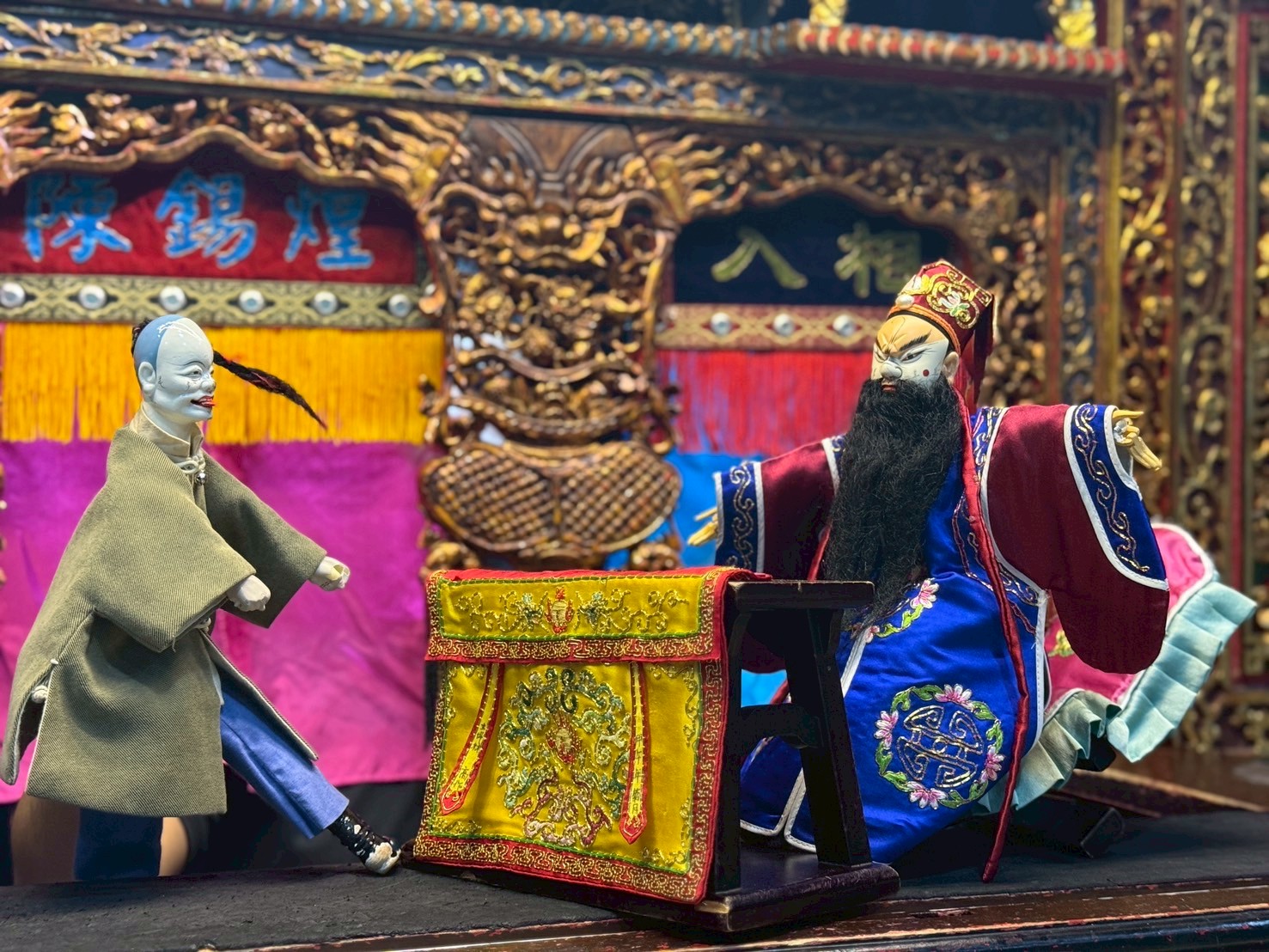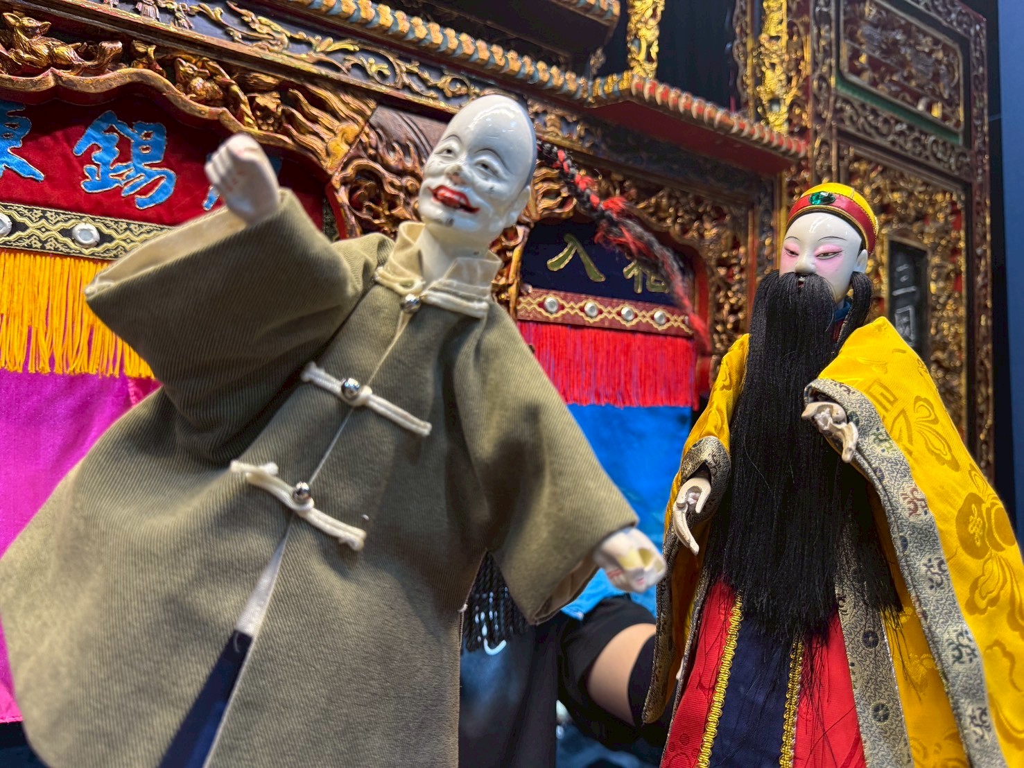 當敘事從皇帝出巡的宏大背景逐步聚焦至彩樓內的小空間,觀眾的視線也自然被引導至操作細節本身。此時戲偶衣袖的擺動、身段的微傾與停步時的重心轉移,不單是技法輸出,而是身份的延伸。這樣的觀看方式迫使觀者放慢節奏,在凝視中理解角色的位置與心理狀態,重新感受掌中戲「以小見大」的敘事力量。