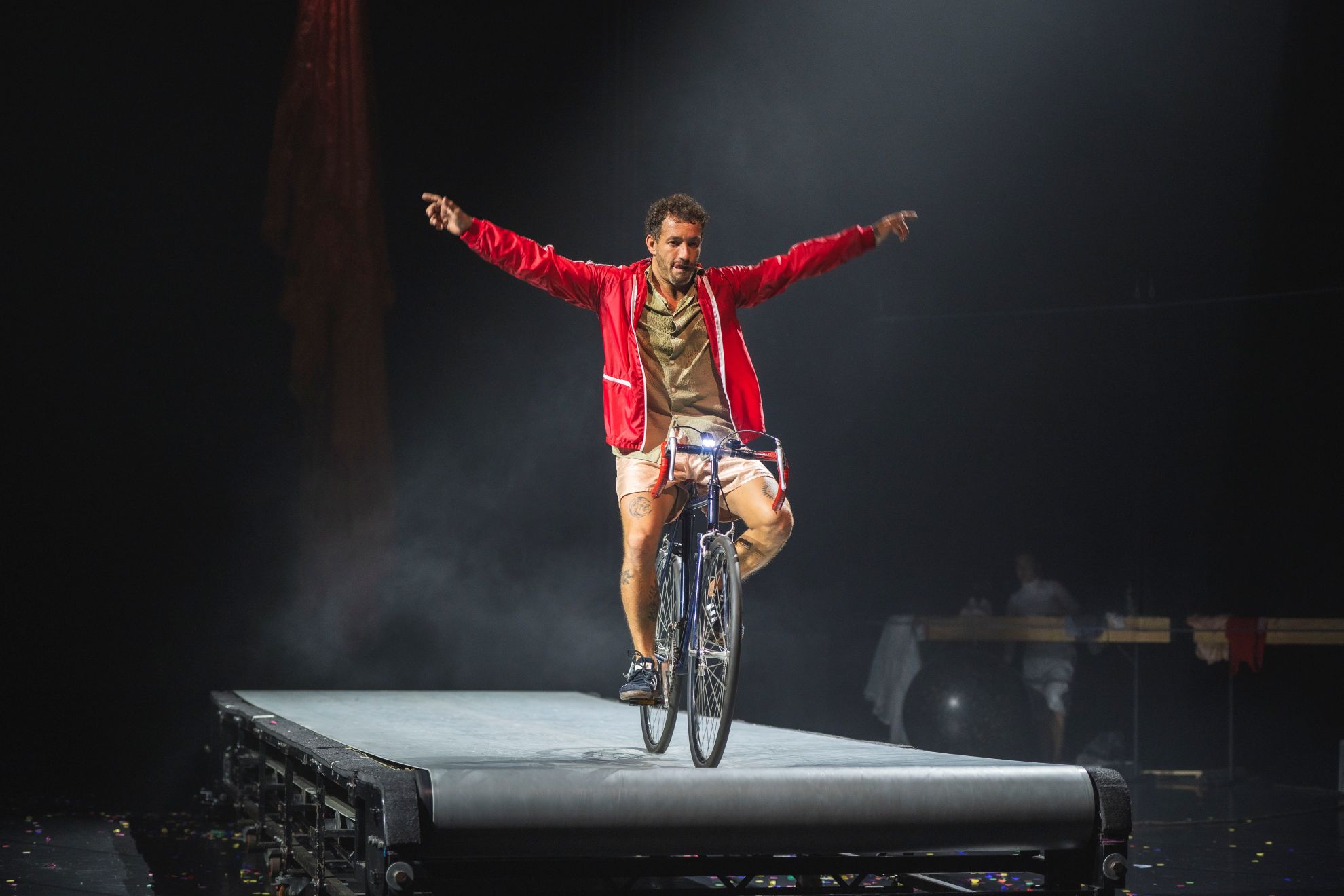 如今,雖仍能在作品中感受到馬戲演員有別於一般表演者,有著極高的身體素質與協調性,但除了末段馬戲演員的大環(Cyr wheel)【2】與跑步機裝置的搭配,短暫出現的高難度技巧外,多數段落已不再訴諸技藝的驚險,而轉向劇場、音樂、物件與象徵的詩性串聯。