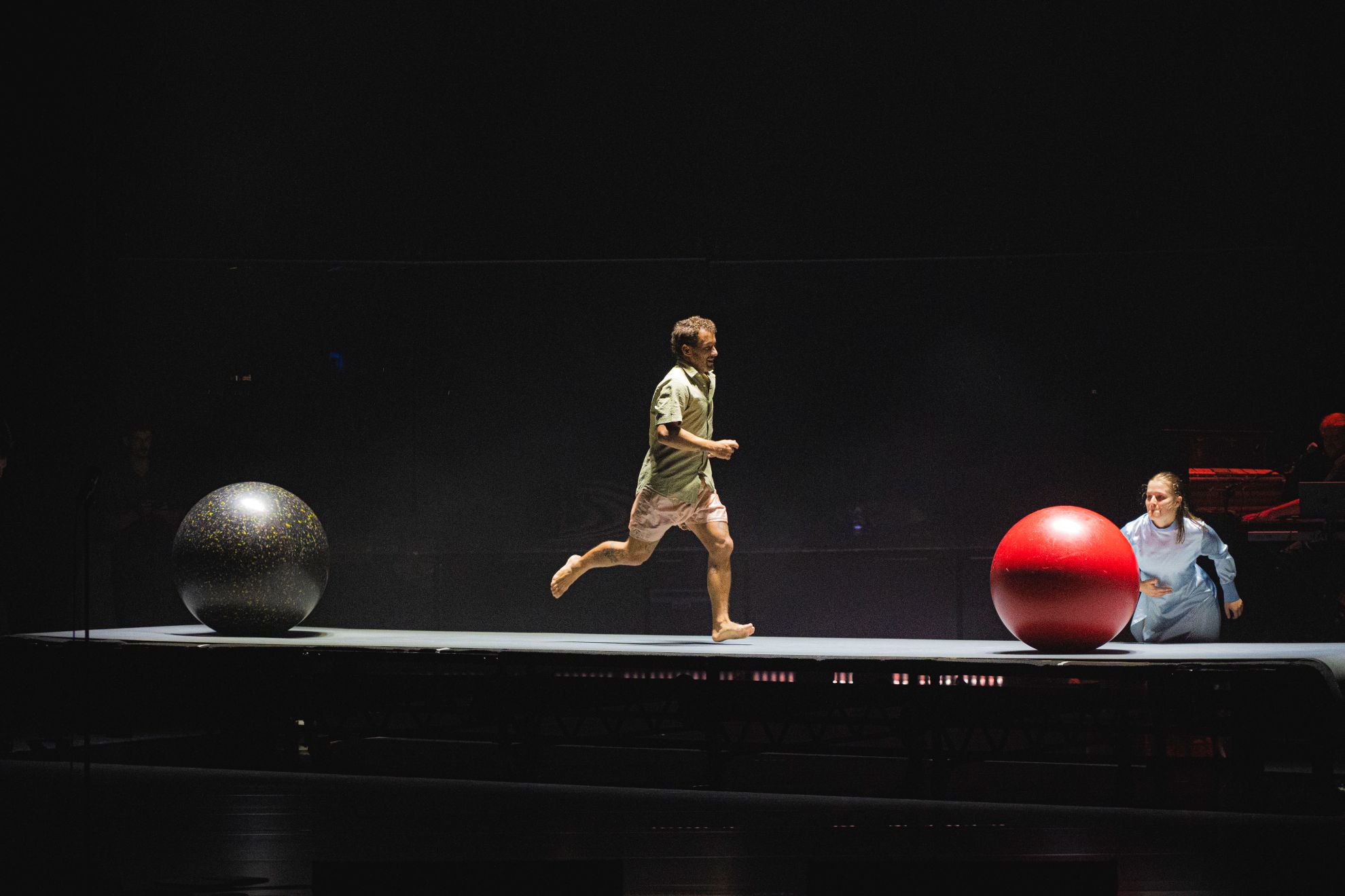 舞臺上,被一臺延展至中央的大型跑步機佔據,成為整個演出的軸心。四位馬戲演員在上頭輪流奔逐、滑行、跌落、再起,彷彿被無形的時間推動。在現場演奏弦樂、電子配樂、人聲合唱不斷疊加下,構築出一種「被迫向前」的人生進行曲,以具象的方式將「現代生活的倦怠與競逐」視覺化——我們看著他們奔跑,也看著他們被奔跑吞沒。