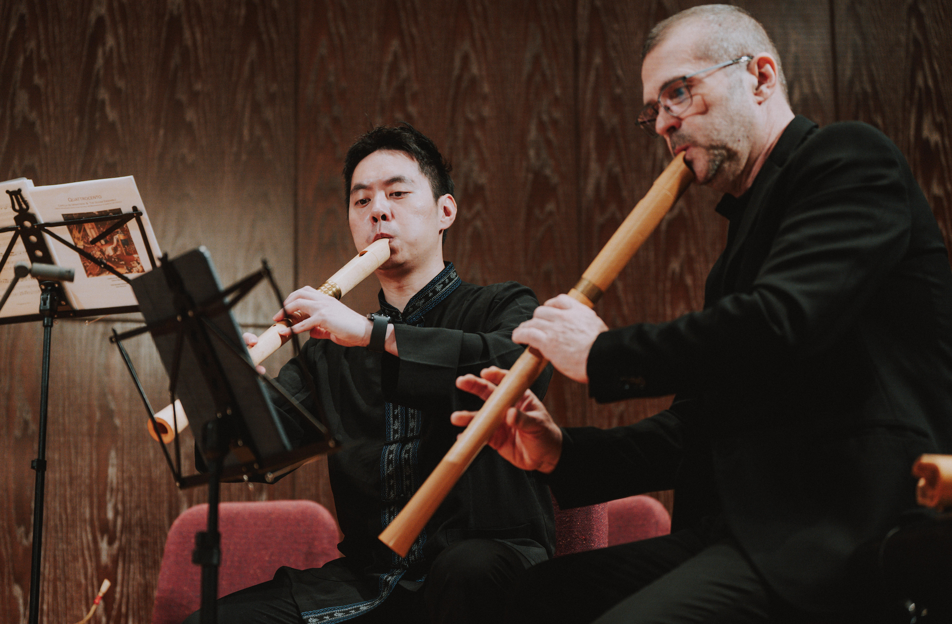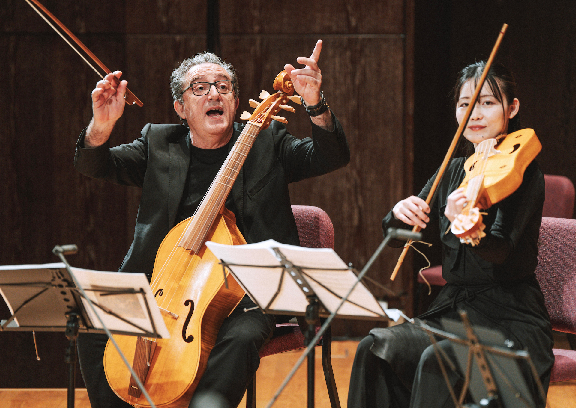 其二,讓復古演奏純粹地審美化、排除歷史知識帶來的自我證成。就如古樂學者海恩斯(Bruce Haynes)曾提出的,我們應接納「早期音樂的終結」(end of early music),並以更純粹的「修辭音樂」(rhetorical music)一詞稱之,【7】藉此和其他的各種「主義」在美學維度上抗戰。在歷史故事的光輝下,其實有更多屬於演奏(家)本身的光彩值得被看見:大使古樂團Carles Magraner充滿人文主義氣質與深厚學養的維奧爾琴音、蔣皓任吹奏風笛的浮誇修辭、大下詩央演奏中世紀提琴的穩重與安定、撥弦演奏家Robert Cases的生動自在,甚至是木笛演奏者梁益彰與David Antich兩人讓人大呼過癮的同台炫技飆奏等,其實都讓人印象深刻,也更該成為音樂會焦點。