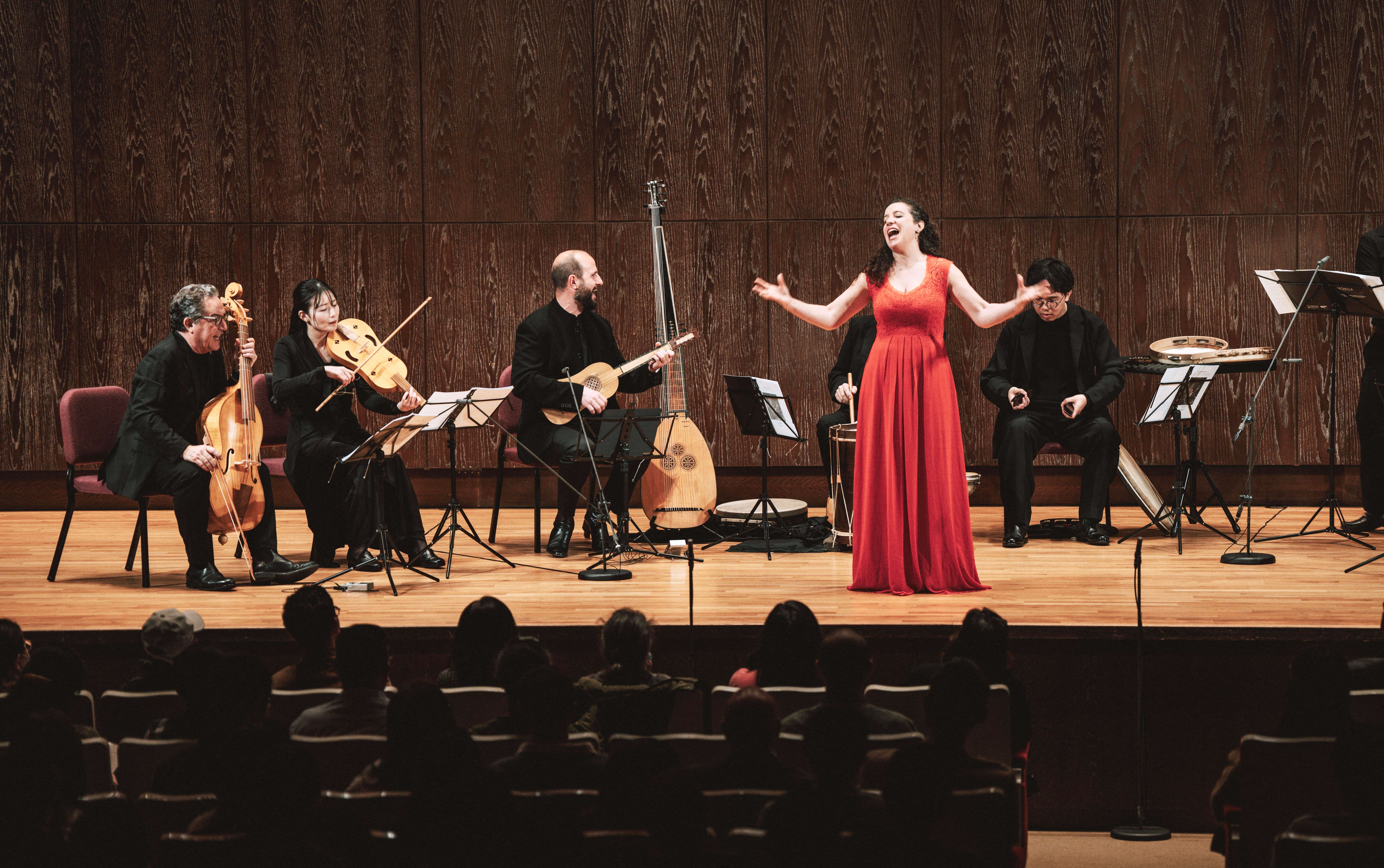 熟悉西方音樂史的人應知,文藝復興時期的樂譜手稿大多僅有三、四行甚至單行旋律,小節數簡短,並未記載速度、力度、樂器使用、伴奏方式等細節,僅是粗略的骨架。因此,這些面向除了從其他文獻史料旁敲側擊,也就有賴演奏家的事先設計與當下發想。於是當晚便可見音樂家們自行添入的大量靈感巧思——例如,在本來單薄的旋律外,添上了作為引子的動感打擊或維奧爾琴節奏組,增加戲劇性的效果;或是在歌唱的段落之間,加入了呼應對答的獨奏與伴奏,形成歌劇詠嘆調般的層次;又或是在一次次的段落反覆中,靈活且即興地加入伴奏的聲部、華彩繁複的炫技等。音樂從短短幾十小節,擴張成了數分鐘的長度。演奏家之間彼此密集交流眼神,以呼吸或肢體語言相互暗示、溝通及協調,這些互動清楚地顯示,當晚的演奏實踐其實是宛如爵士樂現場的鮮活創造。