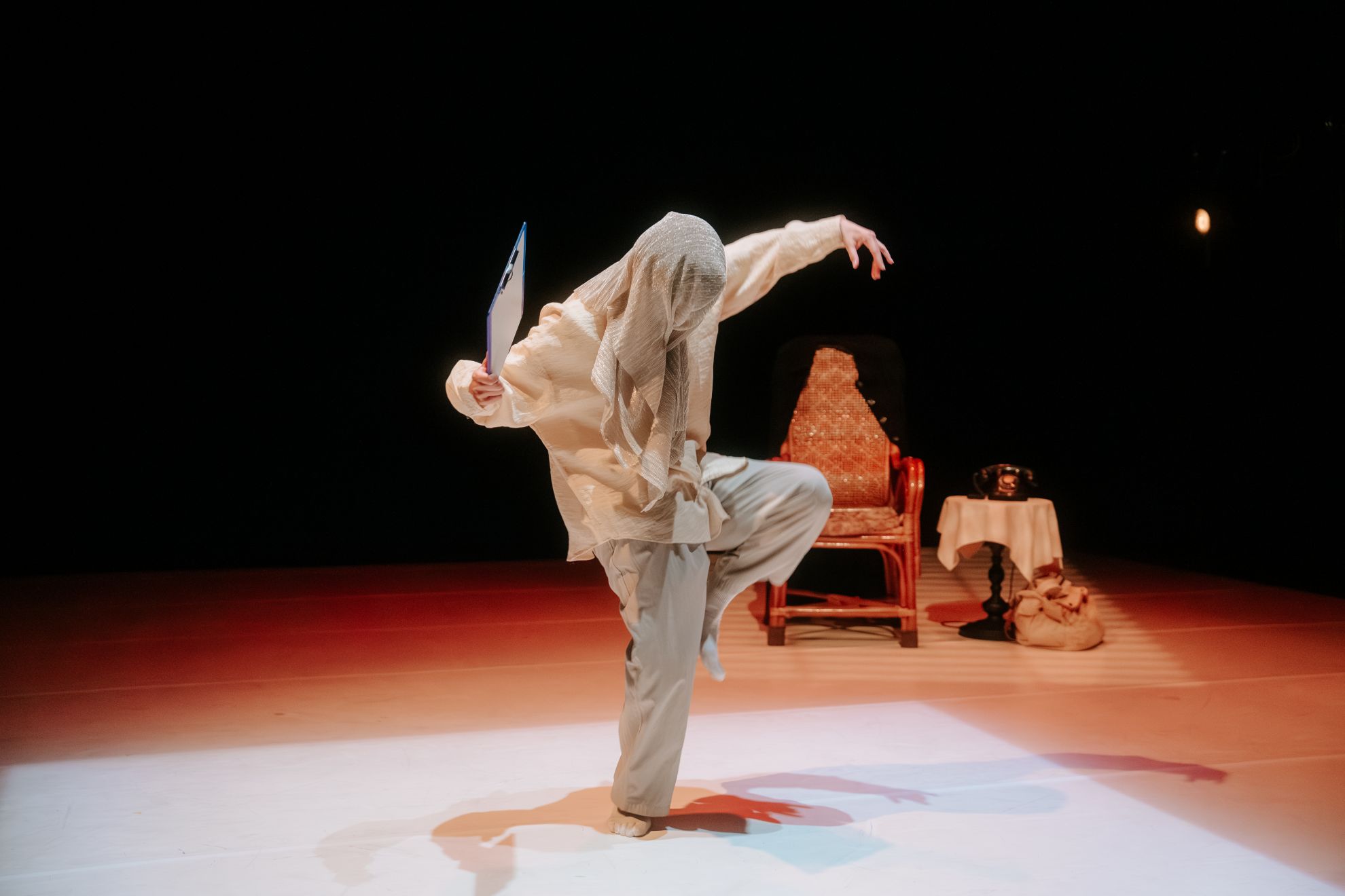 下段,在門的另一側(左舞台邊),電話鈴聲不斷響起,紅光自上灑落。一雙掛在扶手的腳嘗試接起電話,隨即電話聲止息,椅子被旋轉一百八十度。原來坐在那裡的是一位頭戴亮面絲巾的女舞者,她拿著第一章出現過的藍色板子,在椅子前方進行一場詭譎的互動。她用板子戳向自己,一會又被「觸碰」的身體部位作出回應,同時伴隨著難以辨識的竊笑聲。然而令人費解的是,這場自我遊戲的結尾,她竟對椅子行單腳蹲姿的敬禮。
