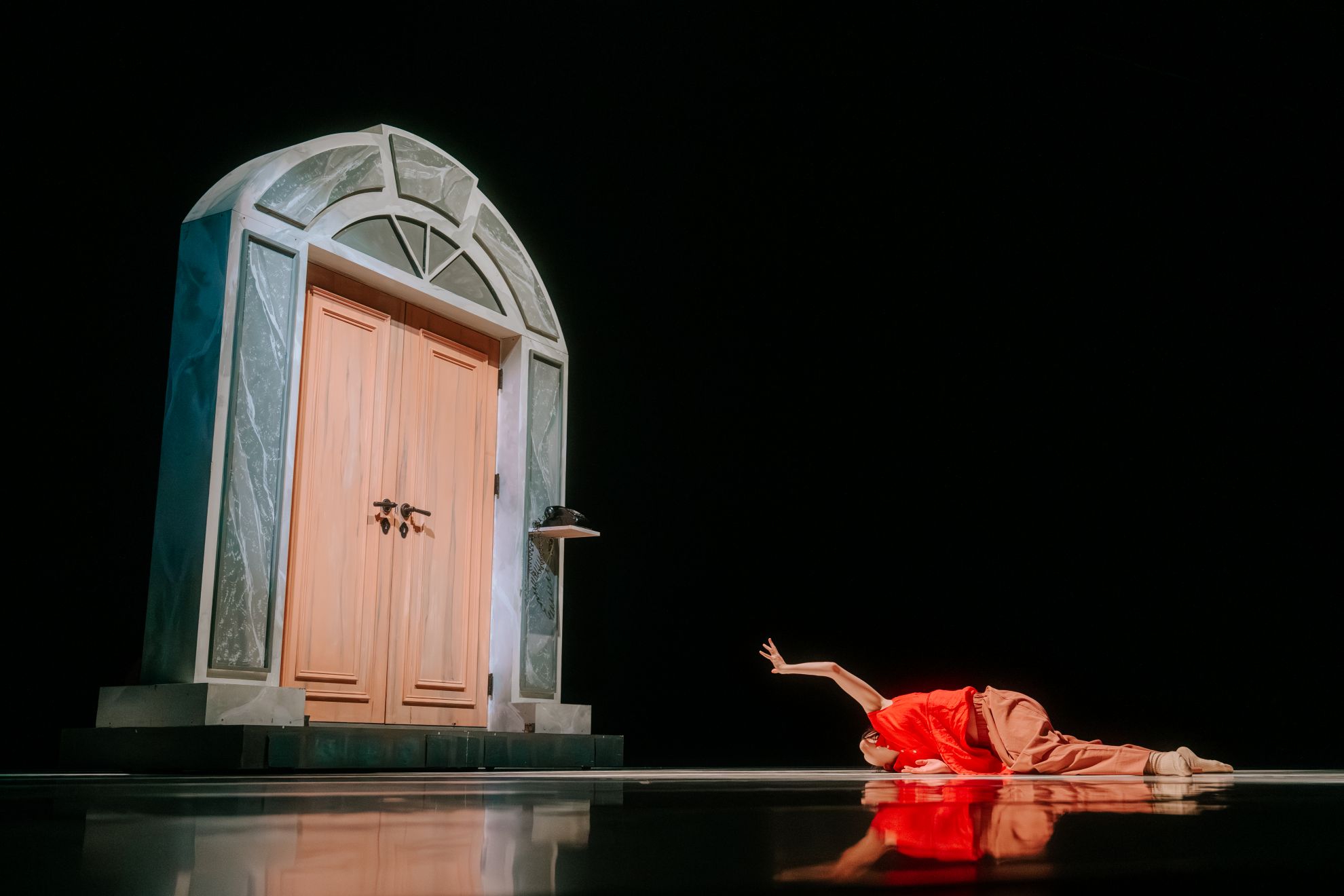 第三章作為編舞者自我詮釋的段落,舞台上的門改以直立方式垂直於觀眾席擺放。不同於前兩章以大幅度、戲劇化的肢體語彙向觀眾傳遞現況,舞者羅文瑾以靈動的手指帶領身體,從右側門框緩步移向右下舞台的桌前。一個流暢的後滾動作,彷彿她早已熟悉此地的佈置。隨後,她以雙腳上的鞋子敲擊桌面,空間氛圍自此開始脫離先前權力場域的敘事視角。這種「迷離之感」在她的動作中被放大:一手試圖在桌上書寫公文,另一手卻將紙張推離,這樣的「不同步」凸顯了舞者人格的雙重性。於是問題浮現——她是誰?她身在何處?