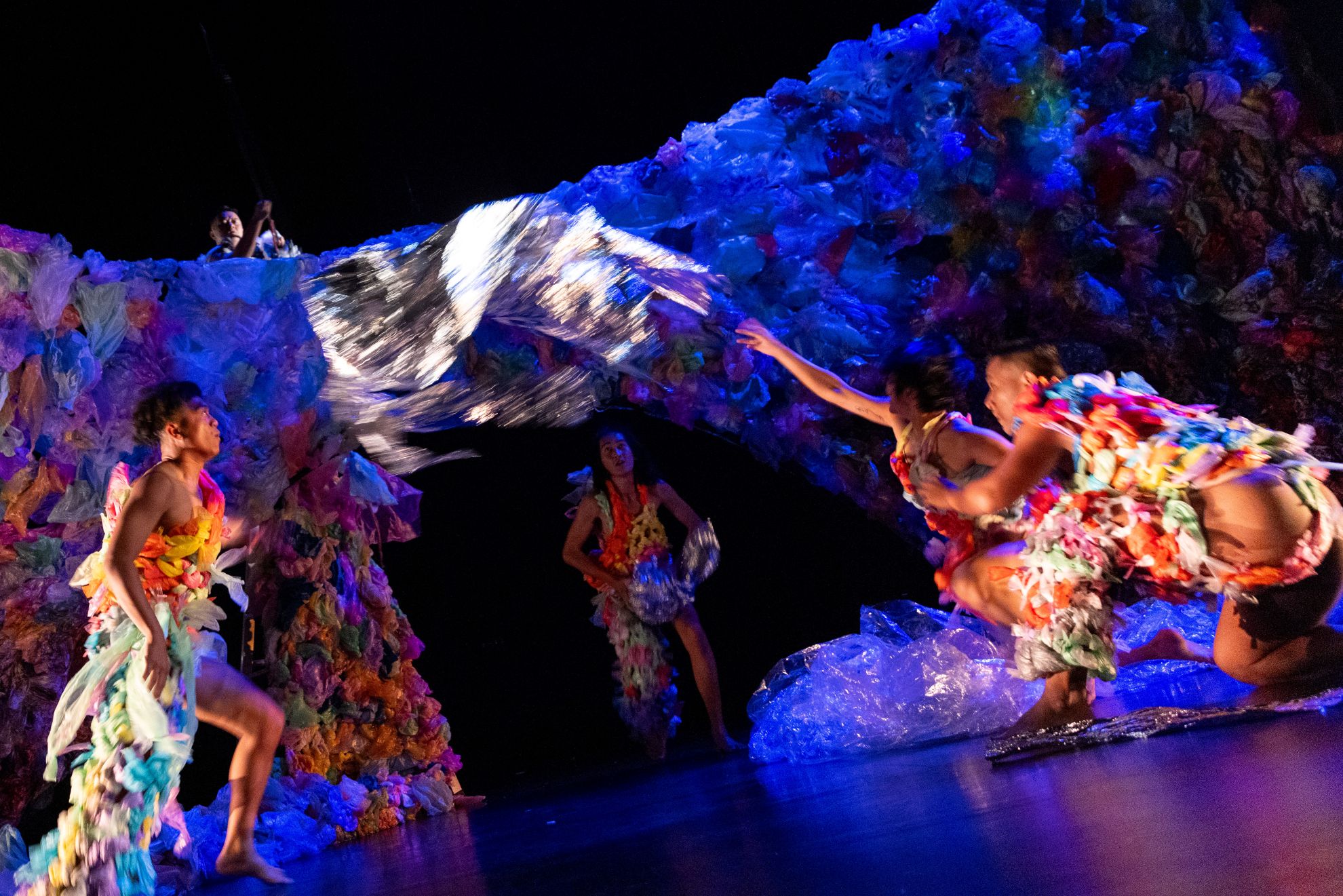 首先,此作透過顏色,將舞台打造成籠罩現代性氛圍的場域。舞台上有一座巨大的帳篷,帳篷上披滿了五彩繽紛的塑膠袋拼布。舞者們進場時的衣著亦與此同調。塑膠袋的皺褶與反光,讓這些色彩雖然繽紛,卻無法顯出鮮豔與飽和,反而透著頹靡衰敗的氣息。彷彿在宣誓著受人引以為傲的現代性也不過是外強中乾。