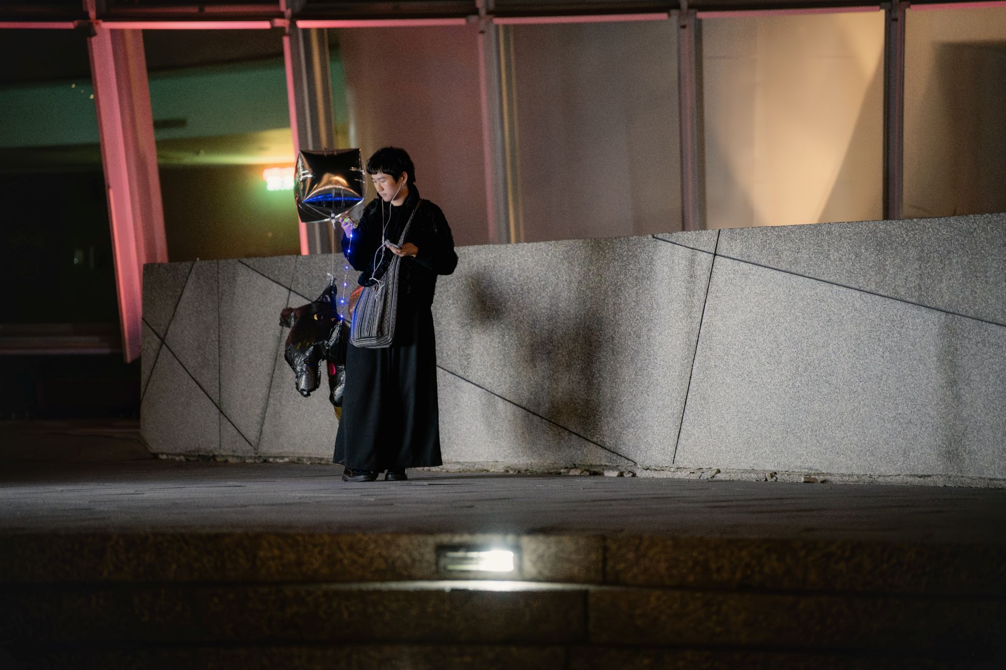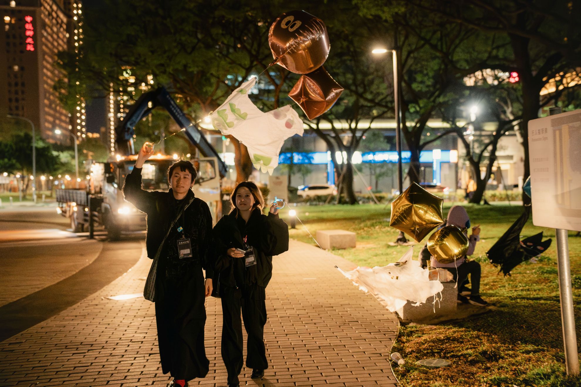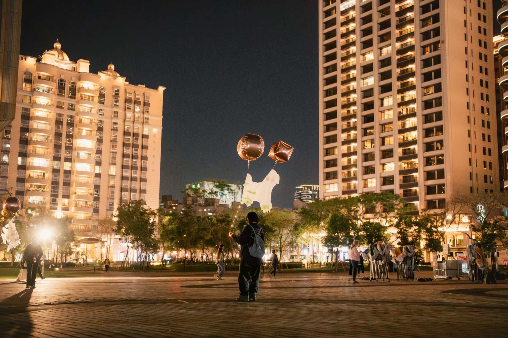 在空間意義上,除了桃園展演中心,或可進一步思考不同公共空間的社會屬性。藝文中心的空間屬性自然容易吸引文化與經濟資本較高的群體,雖然在此也能看到夜晚遛狗的民眾,但不同公園亦有其特定的族群生態與空間意涵,若能移動至不同場域,或許有助於拓展對話人群,並延伸更多空間意義深化的可能;而在形式設計上,若氣球的設計初衷之一是為了比擬遛狗時的「中斷體感」,未來或許能進一步深化這種斷裂經驗——例如加入突如其來的雇主訊息、電話,或是在公共空間可能被盤查證件的心理壓力。特別是觀眾租借收聽設備時正需要押證件,這之間或許存有隱微的設計空間,讓更為複雜的日常經驗,也能被進一步整合進作品的細節之中。